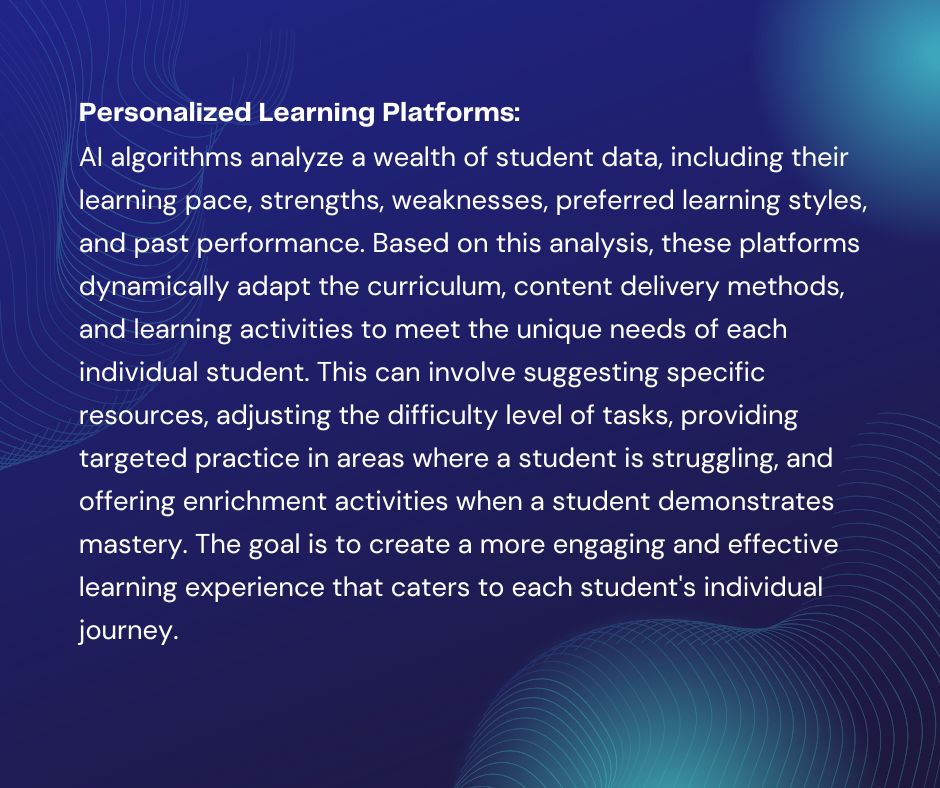 - Personalized Learning Platforms: AI can analyze student data to tailor learning paths and provide customized content.