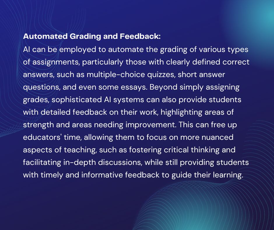 - Automated Grading and Feedback: AI can streamline assessment by automatically grading assignments and providing detailed feedback.