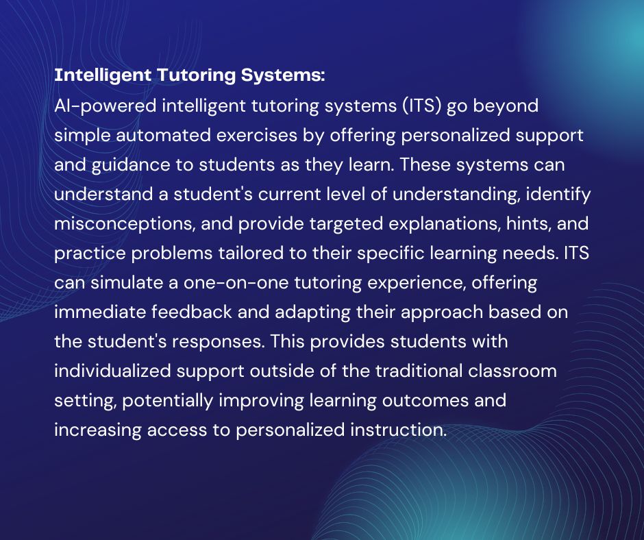 - Intelligent Tutoring Systems: AI-powered tutors can provide personalized support and guidance to students.
