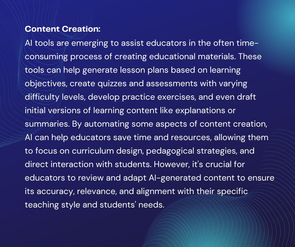 - Content Creation: AI can assist educators in generating lesson plans, quizzes, and other educational materials.