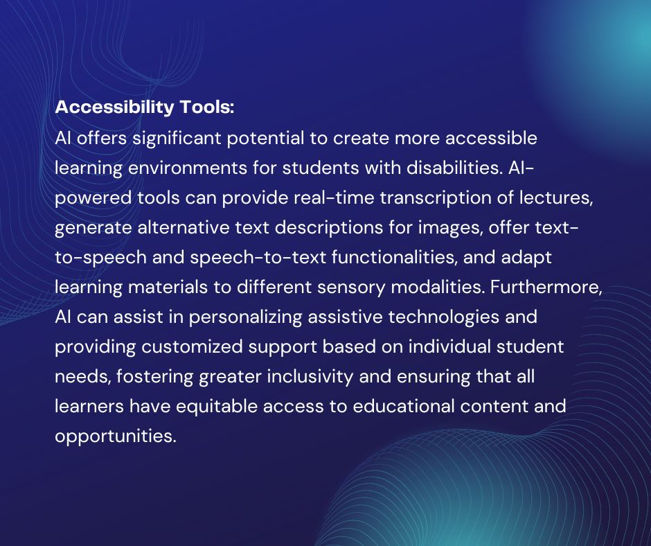- Accessibility Tools: AI can help create accessible learning environments for students with disabilities.